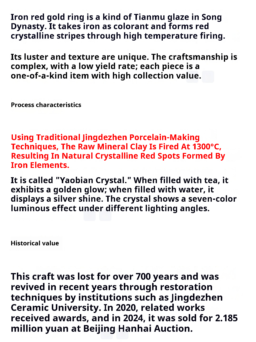 2. Glaze Formula: Following the ancient glaze formula of the Song Dynasty, feldspar, quartz and plant ash are used as the base, and mineral raw materials rich in iron oxide are added to prepare high-iron glaze. The glaze is thick and evenly applied, laying the foundation for the formation of iron red crystals and the presentation of Yohen effect.